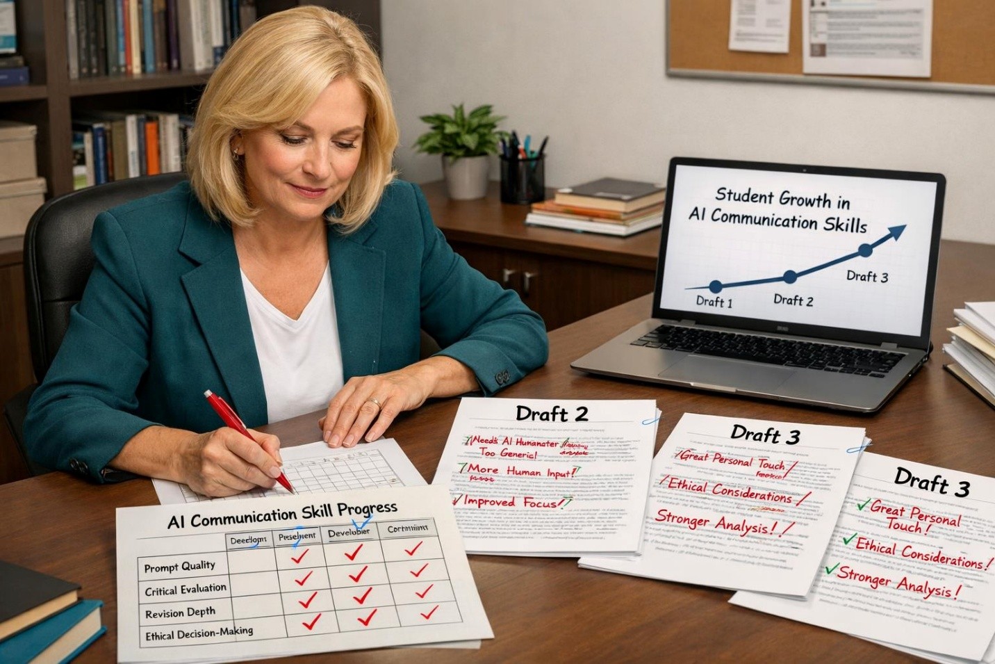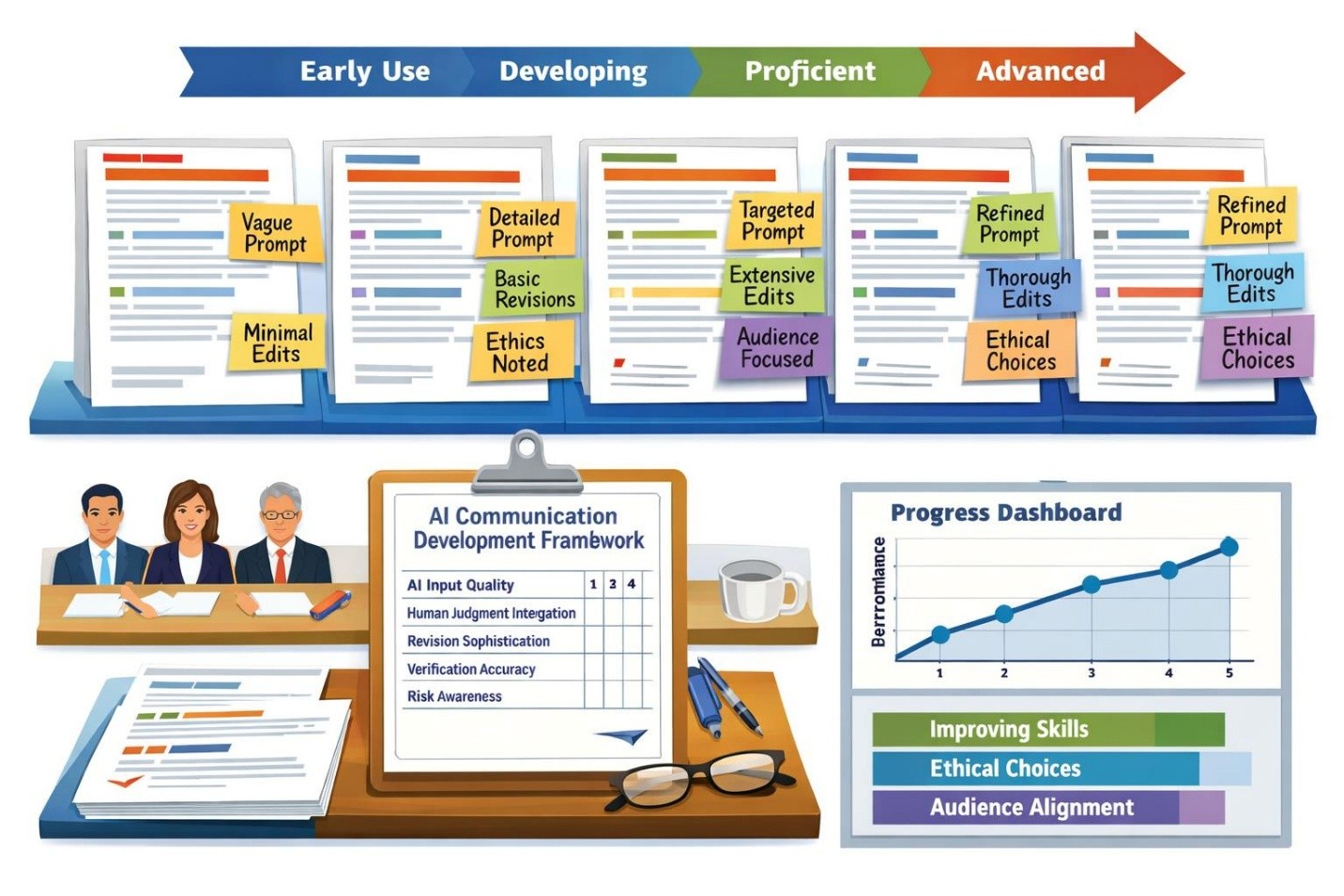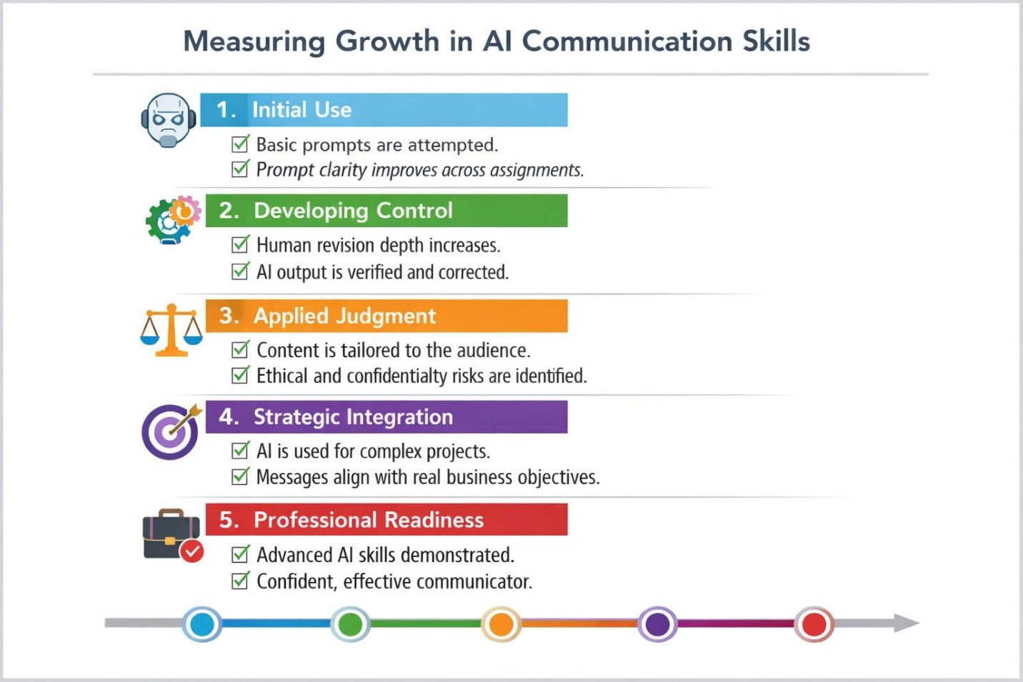 One-time assessments fail to capture growth. AI communication competence develops through practice, reflection, and feedback.