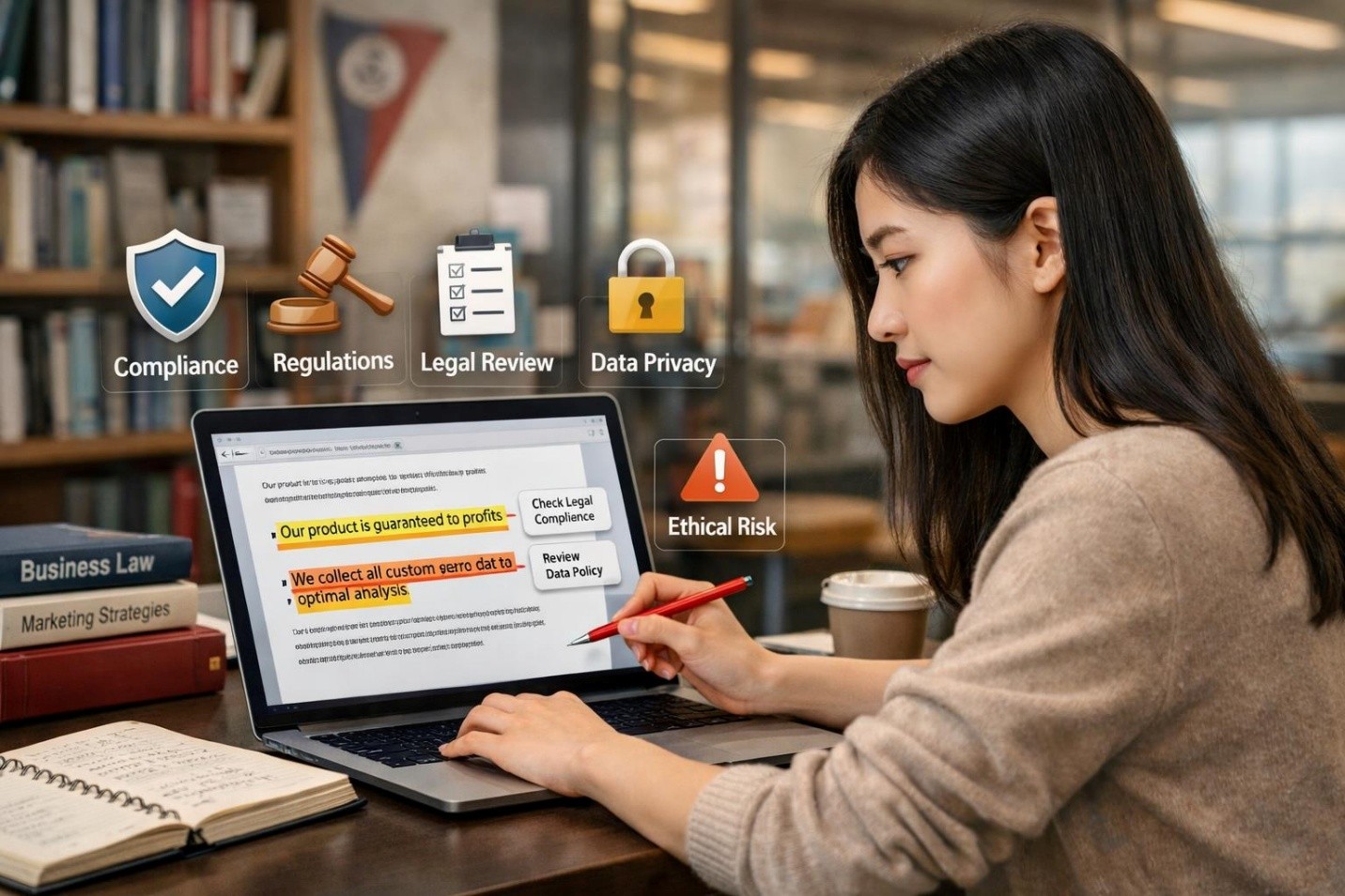 Unchecked AI output can expose organizations to legal and reputational risk. Teaching compliance awareness strengthens professional accountability.